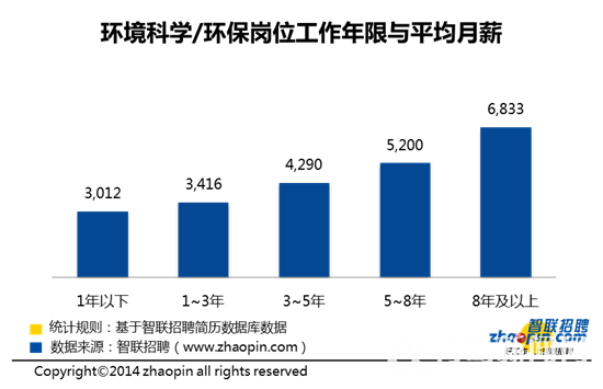 智联招聘数据显示,从环境科学/环保岗位的平均月薪来看,随着工作年限不断增长,环境科学/环保岗位的月薪也在不断增长。当工作年限积累至8年后,平均月薪会有较大幅度的提升。