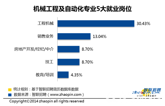 智联招聘数据显示, 机械工程及自动化专业的职场人士从事的前5大岗位是工程机械、销售业务、房地产开发/经纪/中介、技工、教育/培训。其中,工程机械岗位与机械工程及自动化专业最相关,从事工程机械工作的本专业职场人士比例为30.43%。此外,也有8.7%选择了在与本专业有一定相关性的技工岗位工作。智联招聘专家认为,这一现象与工程机械岗位要求较高的专业性,因此大多招聘具有相关专业背景的求职者密切相关。同时,机械工程及自动化专业的技术性较强,也促使一部分求职者选择了技工这一对技术要求较高的高级蓝领职位。