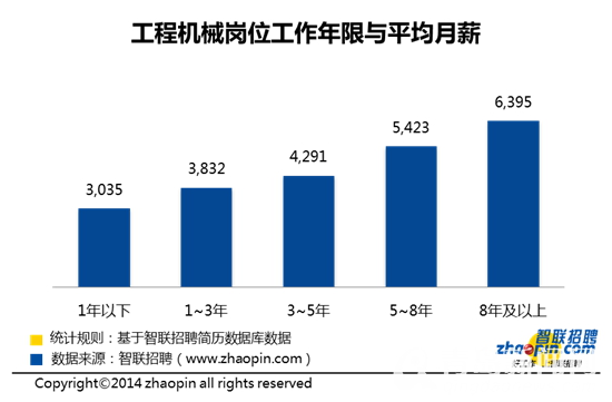 智联招聘数据显示,从工程机械岗位的平均月薪来看,工作年限越长,平均月薪越高。当工作年限积累至5年时,月薪会有较大幅度的提升。