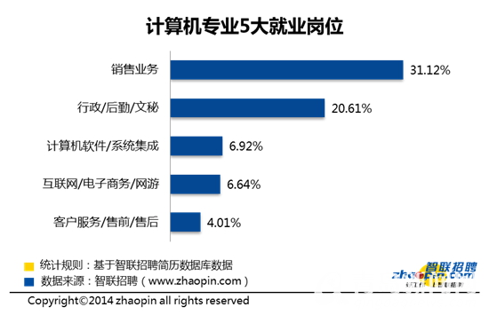 智联招聘数据显示,计算机专业的职场人士从事的前5大岗位是销售业务、行政/后勤/文秘、计算机软件/系统集成、互联网/电子商务/网游、客户服务/售前/售后。其中,与计算机专业对口的岗位是计算机软件/系统集成和互联网/电子商务/网游,从事这两大岗位的计算机专业用户比例分别为6.92%、6.64%;从事销售业务的比例最高,达到31.12%,其次是行政/后勤/文秘,这两大岗位与计算机专业背景关系较小,用户占比过半。智联招聘专家认为,经历IT/互联网行业多年的蓬勃发展后,高校的计算机专业也顺应形势为社会培养了大量人才。但不同学校培养出来的计算机专业人才在质量上存在较大差异,高质量人才少,一般人才过剩,真正能够满足市场需求的高质量计算机专业人才有限。此外,虽然各行各业对计算机专业人才需求量较大,但其中很多职位属于低端职位,工作强度大而薪酬有限,并不能有效地吸引计算机专业毕业生。由此造成计算机专业毕业生中有半数选择了从事销售业务和行政/后勤/文秘这类薪酬吸引力高或工作强度较低的岗位。