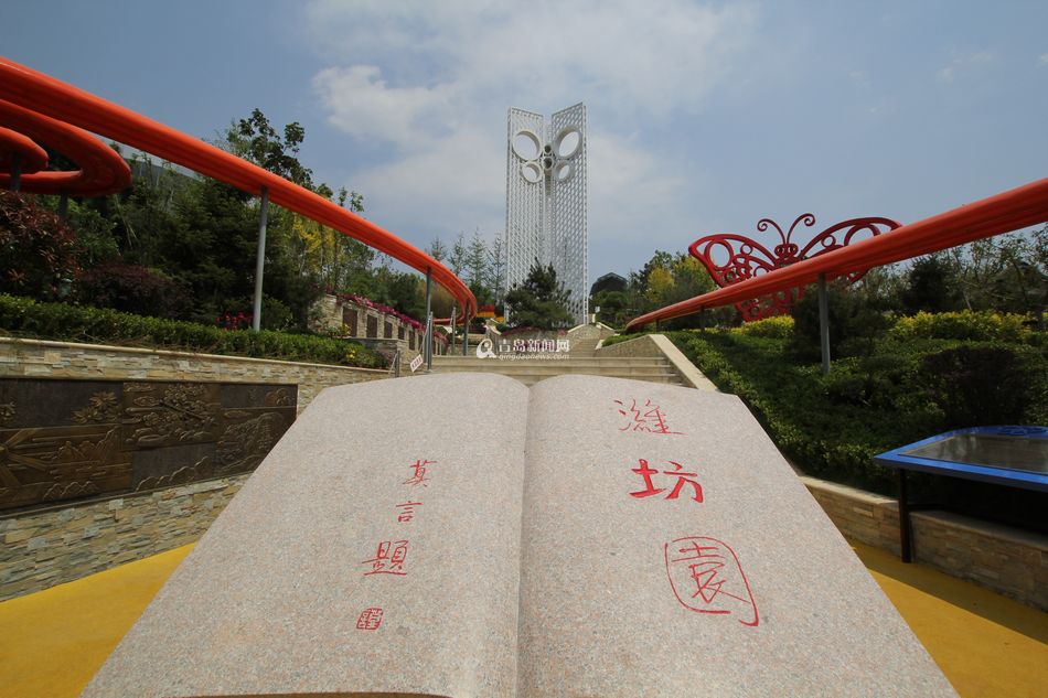 潍坊园主入口标志以书本雕塑形式展示,雕塑由整块石头雕刻而成,书上“潍坊园”三个大字是由莫言先生所题写。莫言先生,原名管谟业,1955年出生于潍坊高密东北乡平安庄。至今已创作长篇小说11部,中篇小说20余部,短篇小说、话剧、散文等近百部,作品被翻译成20余种语言,2012年荣获诺贝尔文学奖。