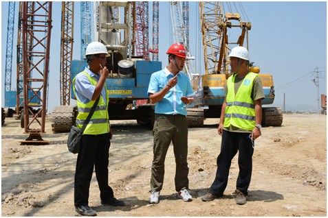 吕克斌正忙着与施工人员交流工程情况