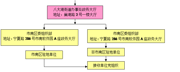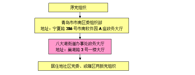 说明:1、原党组织关系所在地开具党组织关系转接介绍信抬头请写:青岛市市南区委组织部。2、预备党员准入新党组织后,新党组织至少需进行半年考察,方可转正。