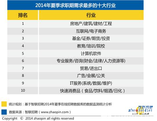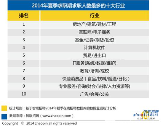 2014年夏季求职者最青睐的行业又是哪些呢?从智联招聘的在线数据来看,求职者投递量最高的行业分别是房地产/建筑/建材/工程、互联网/电子商务、基金/证券/期货/投资。求职者简历投递量反映了在求职者心目中最受求职者欢迎的行业。尽管目前房地产行业已经有下滑的迹象,但求职者依然对房地产业的发展保持较高信心;IT/互联网行业近年来发展前景良好,也刺激着求职者向该行业的转移。