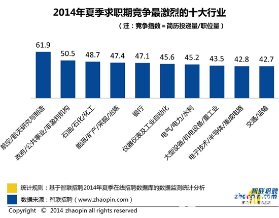 智联招聘在线数据显示,2014年夏季,全国人才供需竞争指数(供需竞争指数=收到的简历投递量/发布的职位数量)为35.2,即从全国情况来看,平均一个职位收到35.2份简历。(供需竞争指数通过单个职位收到的简历投递量,反映职位的竞争激烈程度。供需竞争指数越高,则职位竞争越激烈。)相比春季求职高峰期45.2的竞争指数,夏季求职期的竞争指数下降至35.2,竞争激烈程度大幅缓和。