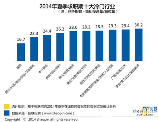 哪些行业是2014年夏季最冷门的行业呢?智联招聘在线数据显示,保险/医疗/护理/美容/保健/卫生服务、中介服务行业位居最冷门行业前三位,竞争指数分别为16.7,22.3,24.4。中国职场一直以来对保险行业从业者的负面刻板印象,导致求职者对该行业的求职意向低下。医疗/护理/美容/保健/卫生服务和中介服务行业也面临同样的境况。