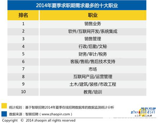 智联招聘在线数据显示,从2014年夏季不同职业对人才的需求量来看,销售业务、软件/互联网开发/系统集成、销售管理三大职业对人才的需求量最大。这些职业的人才需求量最大有几方面的原因:销售职位是几乎所有企业都不可或缺的岗位,需求量较高;同时销售岗位流动性较高,人员更替速度快,不断需要提出新的人员需求,来满足空缺。软件/互联网开发/系统集成行业随着近几年IT/互联网行业的迅速发展而产生大量的用人需求,这一行业正处于迅速增长扩大期,因此招聘需求旺盛。
