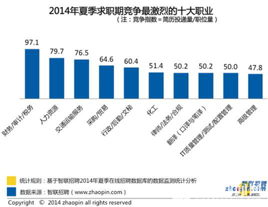 智联招聘在线数据显示,从2014年夏季各职业的竞争情况来看,竞争最为激烈的职业是财务/审计/税务、人力资源、交通运输服务,这三个职业的竞争指数分别为97.1,79.7,76.5。尤其是财务/审计/税务,平均近100人竞争一个岗位,竞争激烈程度近乎白热化。这一现象的原因在于:财务/审计/税务岗位的人员需求量较小,同时人员流动性较小,造成职位数量有限;同时人才市场又供应了大量的相关专业人才,财务相关专业人才一般倾向于从事专业对口的岗位,从而导致财务/审计/税务岗位的竞争十分激烈。