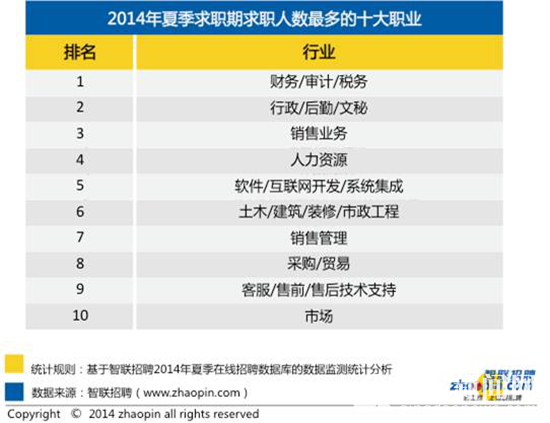 智联招聘在线数据显示,从2014年夏季求职者对各职业的青睐程度来看,财务/审计/税务、行政/后勤/文秘、销售业务三大职业的简历投递量最高。这三个职业中,财务/审计/税务同时也属于竞争指数高的职业,列居竞争指数排行榜的第一位。求职者对这一职位的青睐导致该职位收到的投递较多,加剧了职位的竞争激烈程度。行政/后勤/文秘和销售业务因对从业者的要求不高,因此投递量较大。