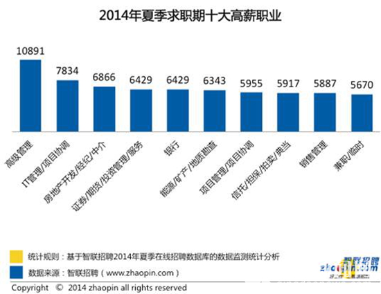 智联招聘在线数据显示,从2014年夏季各职业的薪酬来看,高级管理这一职业的薪酬位居榜首,高达10891元,其次是IT管理/项目协调,月薪为7834元,再次是房地产开发/经纪/中介,平均月薪为6866元。高级管理和IT管理/项目协调的共同特征在于对应聘者的专业技能要求非常高,因此相应地,职位的薪酬回报也处于高位。房地产开发/经纪/中介因行业特性,随着近年来楼市的水涨船高,薪酬水平也较高。