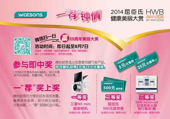年度最重头的美丽大戏当然少不了大家的参与,HWB今年继续发出美丽召集令,与各位爱美之人共同分享美丽秘诀,不管你是个性美人还是清新少女,7月3日至8月7日,关注屈臣氏微信服务号,参加HWB投票吧!个性空降,一“荐”钟情,跟随屈臣氏个性化脚步,见证独家挚爱登上“十大挚爱”舞台,定格专属的2014美丽印记。
