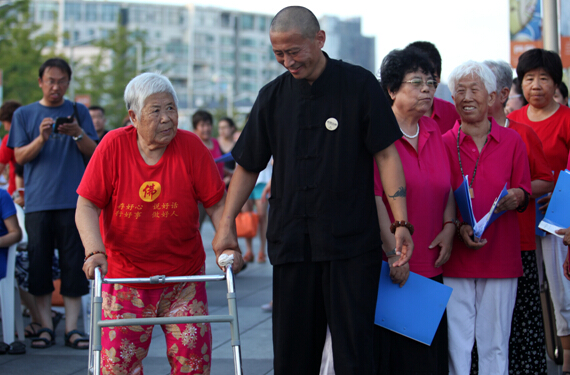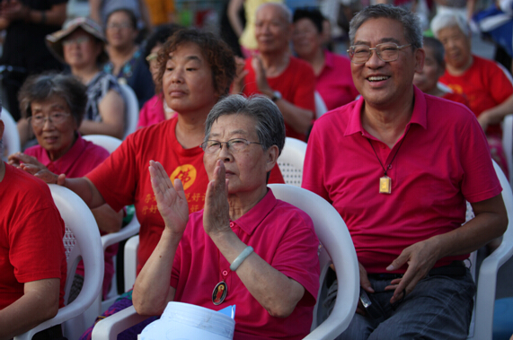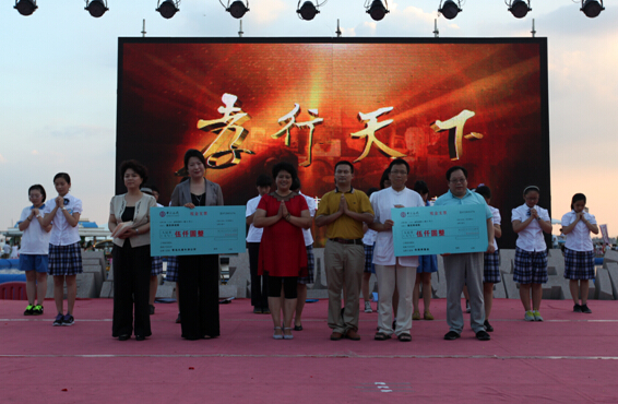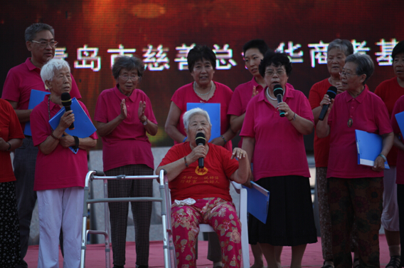 关爱孤寡老人,汇聚社会真情。2014年8月3日 由青大附中团委主办的“关爱老人,点亮青春” 爱心义演在华商孝基金、青岛市女书画家协会、青岛孔裔(牛津)国际公学、北京金莽原文化传播有限公司、青岛城市印象文化公司的大力支持下,于奥帆中心火炬广场举办。与会领导有青岛慈善总会常务副秘书长张耀群;青岛市政协常委、青岛画院专职画家、青岛女书画家协会主席戴淑娟;青大附中副校长李君;青大附中团委书记张立;青岛莲花养老院王莉莉。