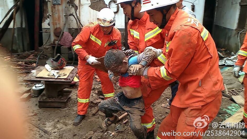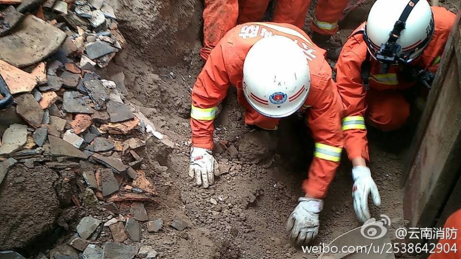 8月4日,消防队员在云南震区废墟中徒手挖人。8月3日16时30分,昭通市鲁甸县发生6.5级地震,震源深度12公里。供图:云南消防总队