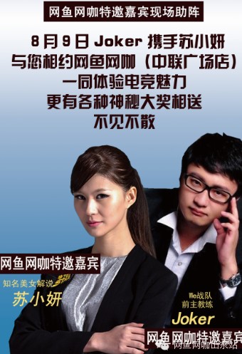 2014年8月9日,英雄联盟电竞解说第一女神苏小妍和WE战队前教练Joker将现身网鱼网咖(中联广场店)与鱼粉们亲密互动!