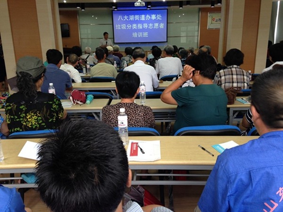 8月7日,社区开展垃圾培训志愿者培训班,共有百余名志愿者参加了此次培训,一个半小时的培训进一步增强了居民对垃圾分类知识的了解,营造低碳环保的良好氛围。 8月8日,配套垃圾桶和垃圾袋全部到位,社区立即清点数量,当日完成了5个物业小区共1831户居民的分发工作。 8月8日、11日,社区将剩余的开放式楼座分组、分片,工作人员和志愿者们轮番上阵,在烈日下将垃圾桶和垃圾袋清点、分类,用借来了两辆三轮车把所有工具送到相应楼座,由楼小组长按户发放到家,共1839户。