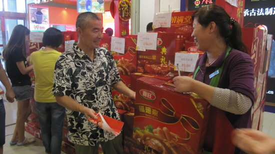中秋即在眼前,节日气氛也日益浓厚,商场里不乏挑选礼品回家过节的顾客。记者走访了几家大商场、超市发现喜旺中秋礼盒均占据了显眼的位置。喜旺中秋礼盒以大红色为主色,配以明黄色,加之喜旺别具一格的标志,新颖亮丽的外观设计使得礼盒颇为惹眼。“一下子就看到了喜旺的礼盒,很大气、喜庆,送这样的礼盒有面子。”一位姓朱的顾客买了两盒“金满堂”打算送给生意上的伙伴,希望讨个金银满堂的好彩头。