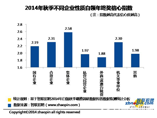 谈及对于2014年年终奖的信心,四成的白领表示非常没有有信心或没有信心,仅一成的白领表示对年终奖非常有有信心和有信心。而其中,合资企业白领对2014年年终奖表现出最高的信心度指数,高达2.31。最低的为外资企业,仅为1.88,其次为私营和民营企业,年终奖信心指数只有1.97 。
