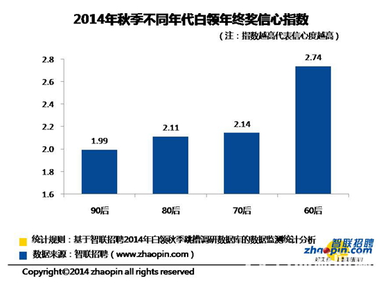 90后2014年年终奖信心指数低于前辈智联招聘此次调查还发现,相较前辈,职场新人对年终奖明显信心不足。有三成的60后白领表示对年终奖非常有信心或有信心,而在90后公司人中的这一比例仅为一成。相对而言,70后及80后的信心指数也不高,只有不到2成的白领表示出了有信心或者非常有信心,其余大多数白领仍然觉得没有太多感觉或直接表示没有信心。