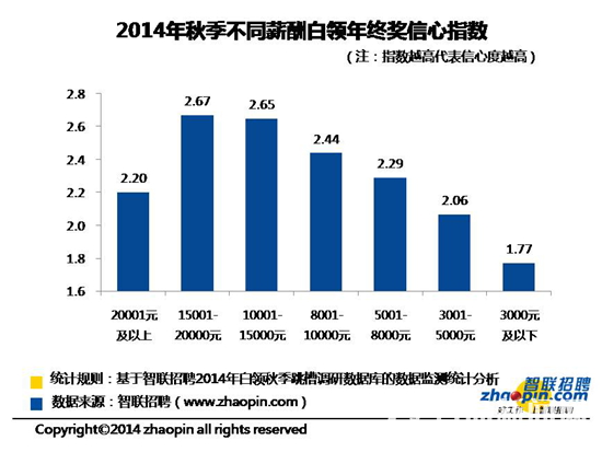 15k-20k信心最高;薪水越高,对年终奖更有信心?智联招聘此次调查还显示,收入水平对白领的信心度也有影响,月收入2万以下的白领,其收入越高,对年终奖的信心越足。但月收入20000元以上的白领,信心度反而不及月薪5-8k的白领。