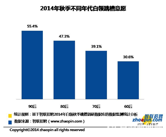 跳槽,90后仍是主力智联招聘调查显示,80、90后依然是职场活跃的人群,尤其是越来越多涌入职场的90后群体。他们对于企业以及岗位的忠诚度都持续下降,工作对于90后来说不仅是一个收入的来源,更是实现自我价值的重要部分,因此许多刚入职场的90后通过自己对职场的自我认知和了解,也在不断进行调整。此次调查显示,90后职场人中,有跳槽想法(含正在办理入职/离职、更新简历和有意向)的比例为55.4%,这一比例在80后仅为47.3%。