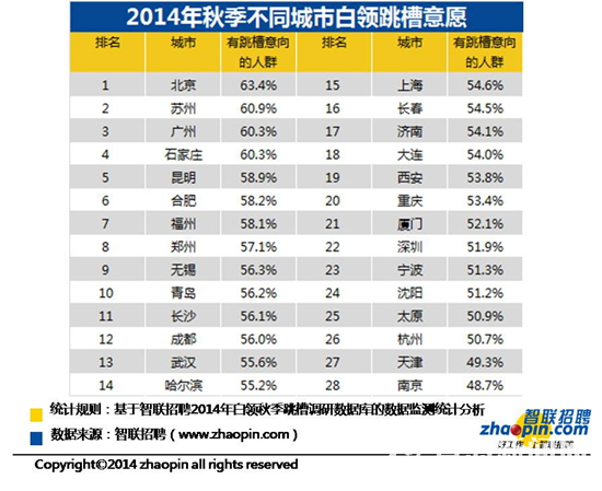 从城市活跃上来看,相比2014年春季,北京、广州的白领跳槽仍然较为活跃,苏州、石家庄、昆明白领的跳槽活跃度也较高;相比较而言,杭州、天津以及南京白领的跳槽活跃度相对较低。