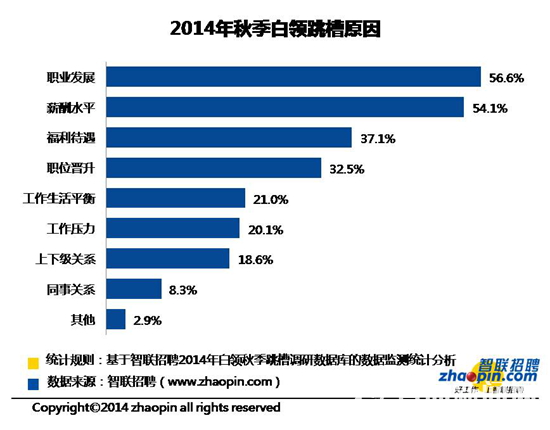 职业发展和薪酬水平是白领跳槽的主要原因,职场人更关注工作生活平衡智联招聘调查显示,2014年秋季白领跳槽原因中因不满薪酬与职业发展受限依然是首要的两大原因,福利待遇和职位晋升也是促使白领跳槽的主要因素。但除了现实原因外,追求工作生活平衡和因工作压力太大也成为白领想跳槽的原因。智联招聘在之前的年度最佳雇主调研中,已经发现“获取生活与工作的平衡”是中国各城市职场人未来3年职业规划的首要目标。此次2014年秋季白领跳槽调研再次印证这一职场动态。智联招聘人力资源专家认为,现代工业社会的主流价值观是充分竞争,职场竞争越来越激烈,公司人面临的工作压力也越来越大。但是随着社会价值观的越来越多元化,公司人的职场价值观也越来越多元化,更多的人希望追求健康的生活方式,希望有更多时间与家人相处,希望生活更加丰富,实现工作生活平衡。这一方面值得广大的雇主关注,如果企业能够控制适度的工作压力,鼓励员工实现健康的生活方式,有助于提升员工的满意度。同时对于职场人来说,做好自己的时间管理和情绪管理,养成良好的职业精神,有效减轻工作压力,最终实现工作生活平衡。