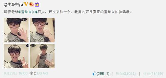 近期,“猜拳自拍”俨然成了微博最热关键词,在微博热门话题排行榜上居高不下。音乐红人华晨宇的加入,点燃了“猜拳自拍”的新一轮热潮,一时间引来了众多网友的模仿,纷纷晒出自己的各式猜拳手势自拍照,卖萌搞怪,“笑”果十足。经证实,“猜拳自拍”确为LG G3为其独具的手势自拍功能打造的现象营销,用户只需对着前置摄像头单手伸掌、握拳,就能启动三秒倒计时,在这三秒内尽可能发挥你的想象,摆出各种表情和姿势,倒计时结束后将自动定格精彩瞬间。另外,全新升级的前置摄像头,超大光圈和自拍界面智能补光设计,及美肤功能等,在更方便快捷的同时也为自拍增添了更多趣味。