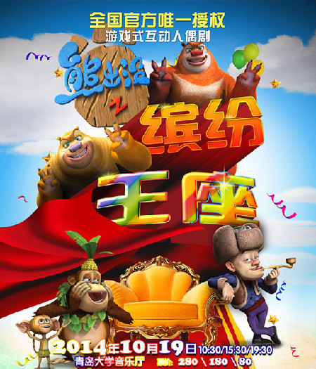 秋高气爽,《熊出没之缤纷王座》金秋来青岛,全新舞台设计,新增观众互动,精彩故事完美呈现!绝佳的亲子接触机会,这个周末,熊大熊二光头强让你和小宝贝一起开心狂欢!你还等什么,10月19日上午10:30分,青岛大学音乐厅等你来哟!