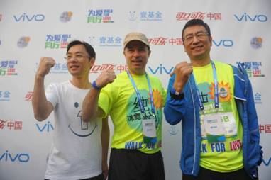 1-壹基金秘书长李劲、可口可乐大中华及韩国区董事长及执行副总裁鲁大卫、卫生部中国健康知识传播激励计划宣传员,央视著名新闻评论员白岩松在出发前为所有的“为爱同行”参与者加油助威