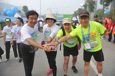 2-卫生部中国健康知识传播激励计划宣传员白岩松(左二)、可口可乐大中华及韩国区董事长鲁大卫(左三)、壹基金秘书长李劲(左四)及相关领导为“为爱同行”队伍鸣响出发枪声