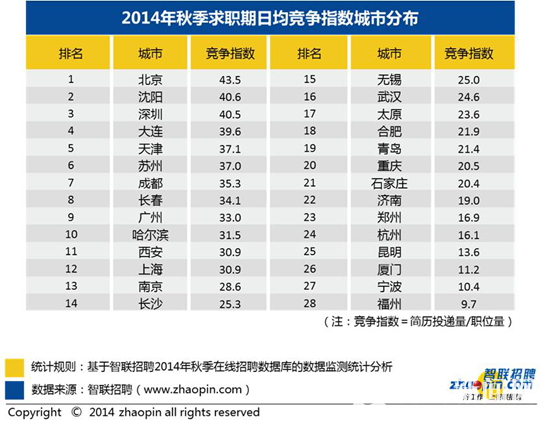 智联招聘在线数据显示,2014年秋季,全国人才供需竞争指数(供需竞争指数=收到的简历投递量/发布的职位数量)为30.7,即从全国情况来看,平均一个职位收到30.7份简历(供需竞争指数通过单个职位收到的简历投递量,反映职位的竞争激烈程度。供需竞争指数越高,则职位竞争越激烈。)相比夏季求职期35.2的竞争指数,秋季求职期的竞争指数下降至30.7,竞争激烈程度进一步缓和。