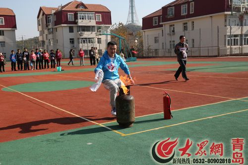预备,开始!”随着一声号令,市南区3位居民,在不到10秒的时间里就将液化气罐冒出的熊熊大火扑灭……11月2日上午,市南区“119小手拉大手”家庭消防趣味运动会在青岛26中学运动场举行,运动会设置了湿手巾灭液化气罐火、20米油盆灭火、消防器材识别、两人三足负重跑等项目。此次运动会共有50多支家庭代表队参加。经过1个小时的激烈角逐,六个家庭队分别取的团体第一、二、三名的好成绩,所有参加比赛的家庭都获得了奖励。