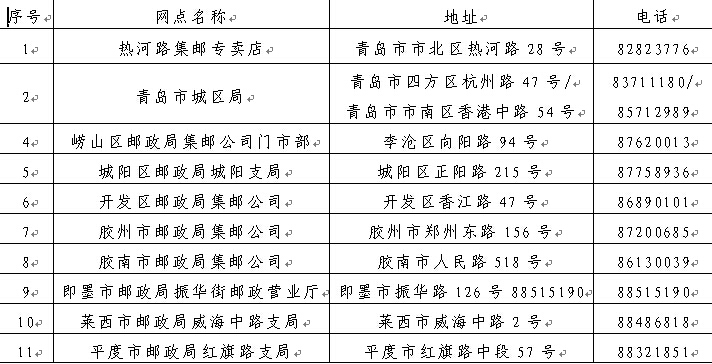 青岛市2015年邮资票品一阶段(11月20日-30日)预订网点