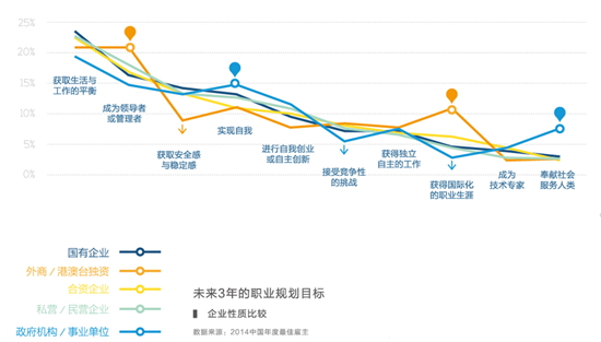 如图所示,相较于其他类型的员工,政府机构/事业单位的员工更希望在未来三年实现自我、服务民众,而对接受竞争性的挑战、走国际化道路的意愿明显低于其他单位员工。而外商/港澳台独资企业中的员工希望在未来三年成为领导者或管理者、获得国际化的职业生涯,他们对稳定性和安全性的要求较低。智联招聘专家认为,不同类型的企业职业发展路径差异很大,导致了员工的未来职业发展规划目标也不同。 另一值得注意之处为,除福利待遇这一普遍的关注点外,在外资企业工作的员工,更关注雇主能否提供广阔的晋升空间,这一现象或反映了外企职员在晋升方面所遇到的瓶颈;而政府机构、事业单位的员工对薪酬福利的关注远远超出了其他类型企业的员工。