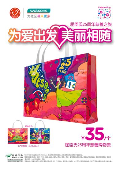 2014年,是屈臣氏进入中国内地的第25周年。据悉,即日起至2015年4月30日,屈臣氏特邀跨界艺术家官纯,创作25周年纪念慈善限量版购物袋,并将在上海、北京、广州等十大城市推出。此次屈臣氏与苗圃行动合作,是屈臣氏25周年慈善道路上的第三波。