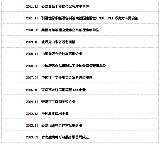 公司取得了ISO9001-2000管理体系认证、HACCP认证、QS认证、CIQ出口商检注册、美国FDA认证、GMP认证等证书。公司的商标“象牙”“巧克力专家”在2010年荣获山东省著名商标,“伊芙莲”在2013年荣获“青岛名牌”称号。