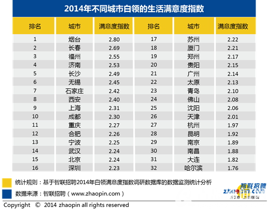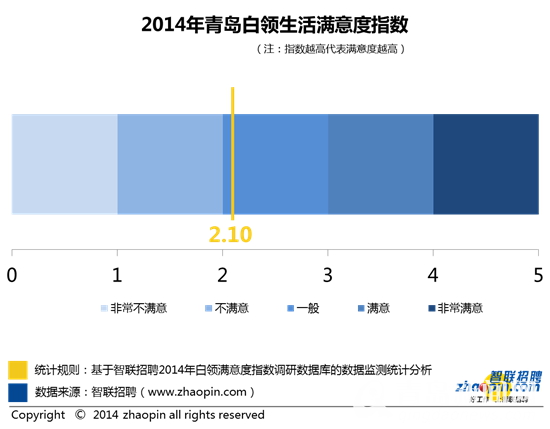值得注意的是,根据报告,2014年青岛白领生活满意度指数为2.10,低于全国白领平均生活满意度指数2.22,在全国32个主要城市中排名第23位。青岛白领对生活的满意度较差。