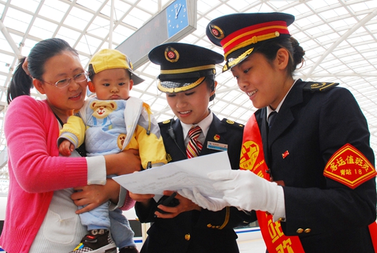 近年来,车站大力实施“文化兴企、品牌兴站”战略,于2002年10月在全国工商总局注册推出了全国第一个铁路车站服务品牌—“阳光家园”,坚持“工作有标准,服务无止境”的品牌核心价值观,以人民群众满意为标准,以持续创新为动力,全面打造个性化、人性化、信息化的铁路运输精品服务,不断提升文化软实力和核心竞争力,为推动铁路科学发展和青岛市经济社会发展提供了坚实的文化支撑和运输服务保障。深入开展党的群众路线教育实践活动,作风保障加快推进铁路改革发展步伐;坚持“安全第一”,落实“盯问题工作法”,促进安全管理规范化、现场作业标准化、检查整治常态化,铁路安全生产持续稳定发展;先后开行青岛至北京、上海、天津、广州、杭州、长沙、合肥、武汉及东北方向高铁,青岛至济南公交化密集开行动车组,动车高铁比例超过普通列车,成为旅客运输的主力军;深化铁路货运组织改革,推出打造跨境“百千班列”和货物快运新产品,畅通铁路快速物流通道,为青岛蓝色经济跨越提供运力保障;积极适应旅客不断提升的运输服务新需求,在服务的可靠性、敏感性、有形性等方面不断创新突破,深层次提升“阳光家园”服务品质,形成了包括“阳光服务超市、阳光俱乐部、旅客抱怨中心、网上阳光家园、青岛北站子品牌集群”等五大品牌服务系统,努力让旅客安全出行、方便出行、温馨出行。
