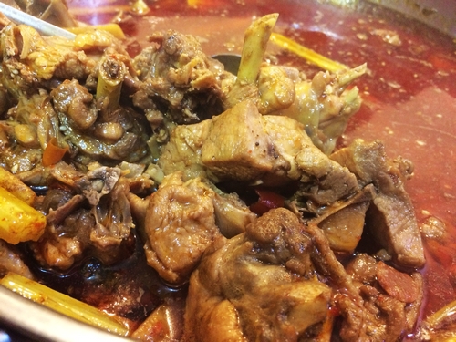 香辣大公鸡选用了沂蒙山区散养的大公鸡,生长期都在一年以上,鸡肉香,肉质鲜美有弹性。鸡公鱼婆采用多年研究的独特配方,香辣口味,很适合青岛人的口味。吃完鸡肉之后,可以再涮斑鱼(这是斑鱼的又一独特吃法),涮海鲜、牛羊肉,口感很不错。单独吃大公鸡,32元一斤。