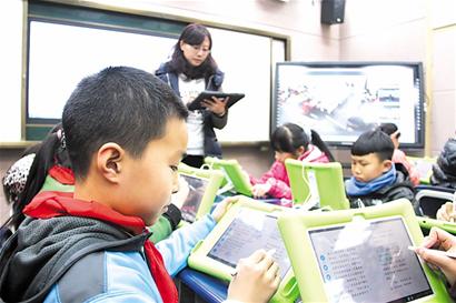 一所学校教师执教,其教学内容可以即时推送,让另一所学校师生共享,这种借助信息技术的传递课堂成为岛城中小学教学改革的时尚。图为太平路小学与定陶路小学专递课堂上,太平路小学教师安婷执教专题略读导学课,可以同步推送到定陶路小学王老师班学生的电子书包里,实现了异校间学习内容即时推送,真正实现了校际间学生学习内容的资源同步共享。