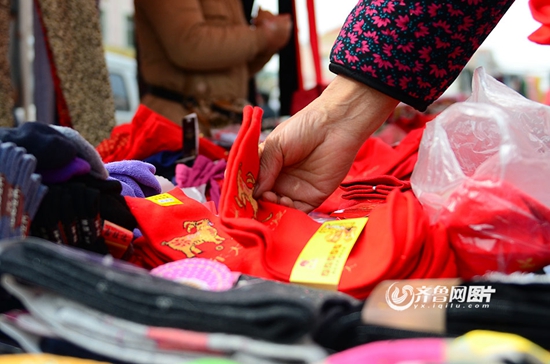 图为市民在摊位前挑选红袜子。羊年即将来到,大集上处处都能见到“羊”的元素。