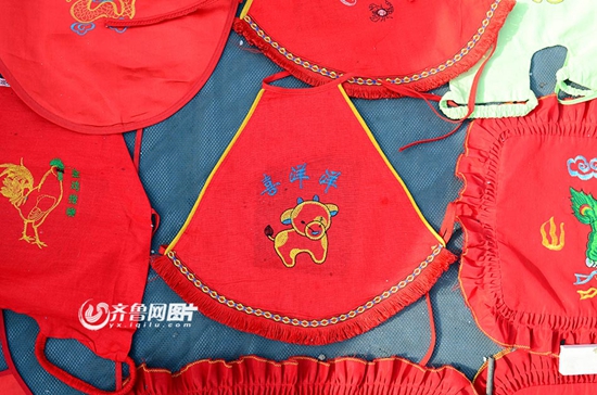 图为辛安大集上的手工小肚兜,肚兜上绣着羊的图案。羊年即将来到,大集上处处都能见到“羊”的元素。