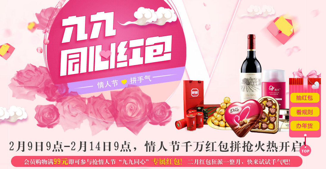 2月9日9点—2月14日9点,情人节千万红包拼抢火热开启!会员购物满99元即可参与抢情人节“九九同心”专属红包!二月红包狂派一整月,快来试试手气吧!
