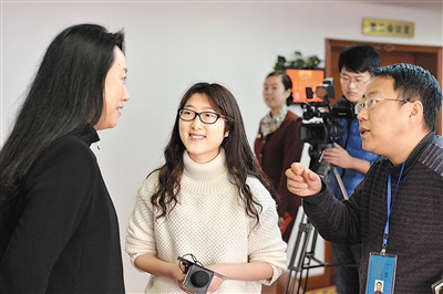 青岛日报/青报网记者正在采访代表。 周光辉 摄