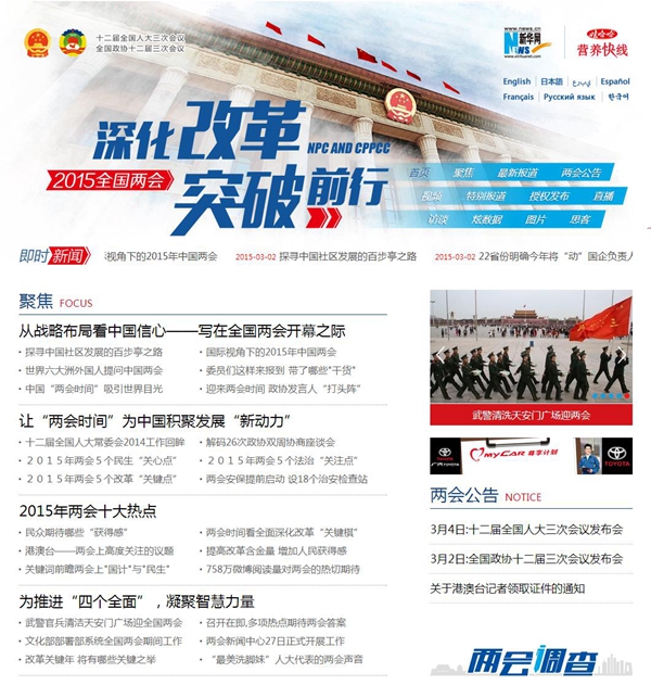 [小编说]两会是观察中国的重要窗口。每年的“两会时间”,人民大会堂都凝聚起世界的目光。虽然今年两会不涉及换届,只是个“平年例会”,但今年是中国的三个重要“之年”——“全面深化改革关键之年”、“全面推进依法治国开局之年”、“全面完成‘十二五’规划收官之年”。处在这样特殊的历史节点上,“平会”也必定不平常。中国的改革下一步如何落棋?换挡减速的中国经济如何激发“新动力”?气势不凡的“打虎拍蝇”还会有什么猛料……从现在开始,请认真听、仔细看、细细品读,从会场中传出的一切讯息。