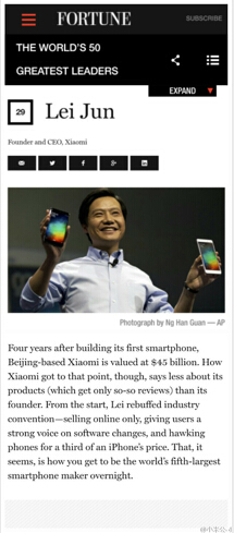 在雷军和他的小米即将迎来2015年的米粉节,同时也是小米公司成立五周年的时候,雷军接连收获了两份厚礼,除了《财富》杂志将其评为全球50大杰出领袖之外,《TIME》时代周刊刊登报道称雷军为“中国手机之王”(China’s phone king).