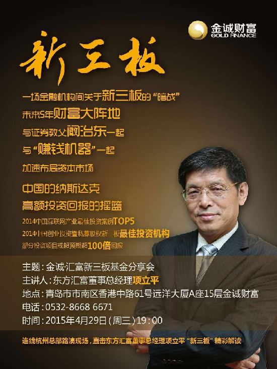 如何投资新三板?选择什么样的公司投资?新三板市场暗流涌动,高额投资回报的怀抱已经向投资者敞开。4月29日(周三),青岛新闻网将联合金诚财富,为您带来一场精彩新三板投资讲座。