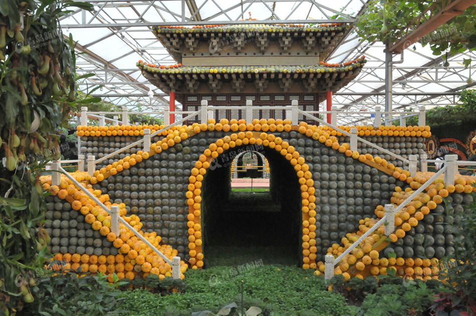 青岛新闻网6月16日讯 16日,“互联网+在山东”全国网络媒体行走进寿光蔬菜博览园。穿行在八号厅蔬菜文化艺术景观展示厅搭配精美蔬菜廊架,一枚枚奇瓜异果长在半空中,一寸寸土地被五颜六色的叶类蔬菜覆盖,用蔬果精雕细刻而成的210余处工艺精湛的人文景观相贯穿,科技、文化、艺术在这里完美地融入蔬菜展览。大型蔬菜文化景观“绿播丝绸路”、 “龙腾菜乡”、“狮舞庆丰”、 “风调雨顺”、“飞天神韵”,气势恢弘,尽显菜乡情韵,几十个趣味蔬菜文化小品,错落有致,妙趣横生。