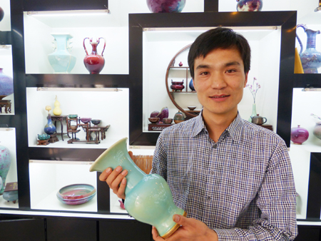有道是功到自然成。今年40岁的白胜利做钧瓷已经22年。其父是原禹州市国营瓷厂的老职工,他从小耳濡目染,对钧瓷产生了浓厚的兴趣。他1992年高中毕业后到孔家钧窑做学徒工,师从中国工艺美术大师孔相卿。从打杂、注浆、拉坯做起,再到造型、配釉、上釉、烧成等工艺,他虚心好学、吃苦耐劳,技艺进步很快,在同期员工中逐渐崭露头角,深得师傅的赏识。他做的素坯,由于质量过硬,是孔家钧窑当时唯一免检的员工。2000年3月,由于他为人忠厚、踏实肯干,而且各项技艺都在同事中出类拔萃,孔家钧窑便选他担任新厂的业务副厂长。一年后,白胜利又被调回孔家钧窑担任统计员,全面负责窑口的技术质量。白胜利说,在孔家钧窑的这些年里,他不但学到了全面又扎实的钧瓷制作技艺,而且从孔相卿大师那里学到了如何宽厚待人,如何成为一名“德艺双馨”的钧瓷大师。