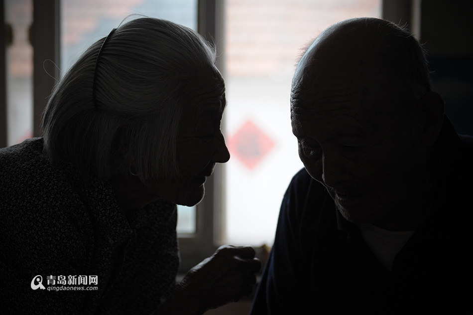 92岁的王月海老人的听力非常差,青岛新闻网记者在询问问题时,一旁87岁的老伴儿便成了翻译。王老的老伴儿时不时凑到他耳边,大声重复记者的提问。(孙志文 摄)